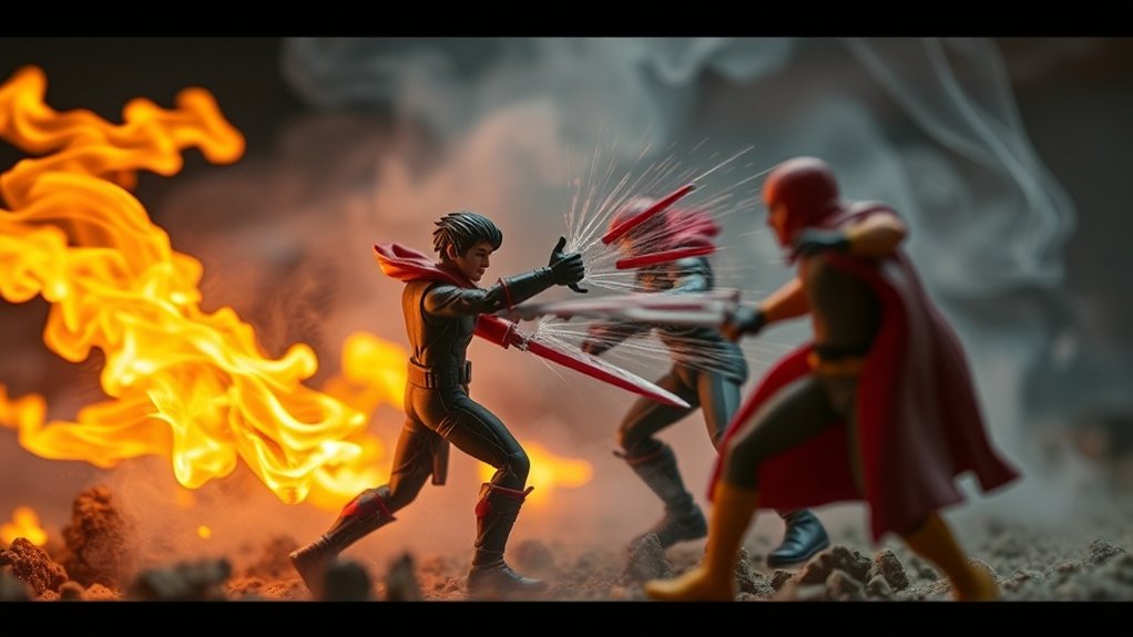 Ever wondered how to make your toy photography truly pop with fiery drama? Start by selecting the right fire textures. Look for high-resolution images that capture the vibrant colors and dynamic movement of real flames. You’ll want textures that are varied—consider flames that flicker, dance, and swirl. Make certain the textures match the scale and perspective of your toys to maintain realism. Websites offering stock images or free texture resources can be great places to find what you need. Pay attention to the light source in your scene; choose fire textures that mimic that orientation. This guarantees the fire blends naturally into your composition. Remember, selecting the right fire texture is essential to enhancing the drama and authenticity of your shots.