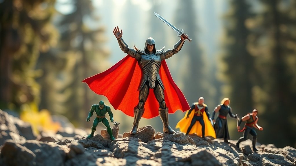 Consider using vignette effects to draw attention to the central figure, guiding the viewer’s gaze to the hero. Adjust the saturation levels to guarantee your hero looks vibrant and full of life. Remember, enhancing heroic features is about balance; don’t overdo the edits. Subtle enhancements can make your toy photographs truly epic.