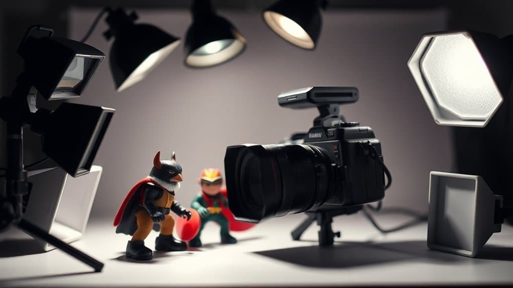 Did you know 80% of photographers struggle with shadows? To manage them, adjust your light angles and use reflectors. Position your toys thoughtfully, ensuring each gets balanced light, reducing harsh shadows and creating a cohesive scene.