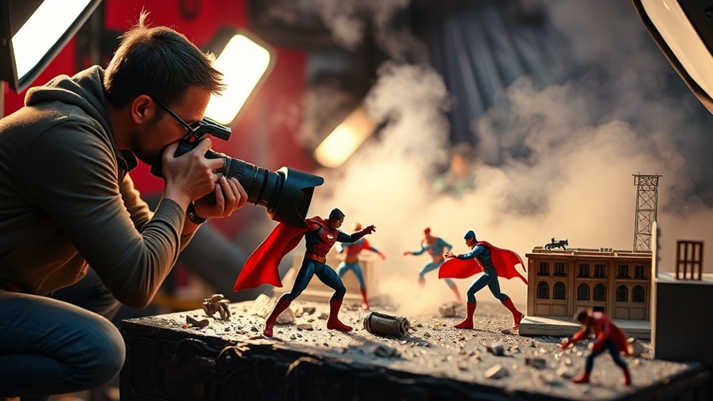 Did you know 70% of realistic scenes rely on practical effects? Use props like miniature debris, dynamic lighting, and smoke to create depth. Arrange figures dynamically. Experiment with angles, ensuring your scene feels alive and believable.