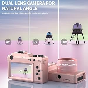 【Front and Rear Digital Camera】The front and rear camera meets self-vlogging and quick take selfie photos with friends.Capturing the long distances and macro scenery clearly with 18X digital zoom.Support to transfer photos by Wifi or USB C cable to pc
