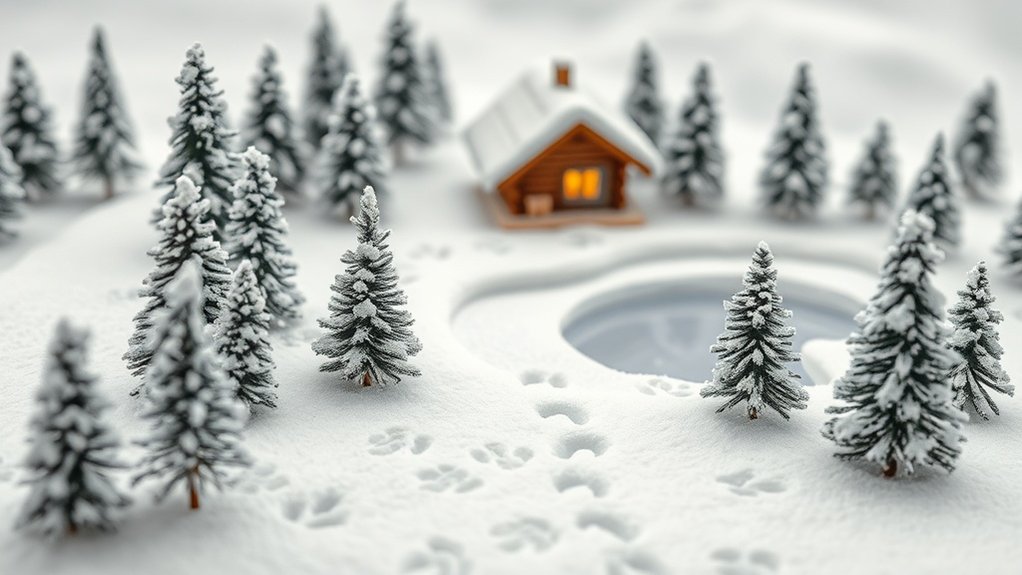 Crafting a convincing snowy winter diorama starts with selecting the right snow texture materials. You’ll want to explore options like baking soda, which provides a fine, powdery snow effect. For a more realistic touch, try using model railroad snow or microballoons, which offer a fluffy, light texture. These materials are excellent for creating drifts and piles. If you’re aiming for a sparkly effect, add a sprinkle of glitter. Just remember to use it sparingly to avoid an overly shiny look. Styrofoam shavings can add depth and dimension, perfect for larger scenes. It’s essential to experiment with different combinations to achieve the desired effect. Don’t forget to test your materials under lighting conditions to guarantee they photograph well.