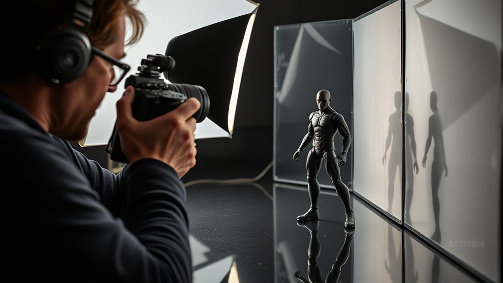 Although achieving perfect lighting is essential, it’s equally important to position and angle your subject to avoid glare. Glare can detract from the details of your figures, so you need to be mindful of how your subject interacts with light. Start by experimenting with different angles to find the one that minimizes unwanted reflections. Adjusting the tilt of your figure can also help redirect light, reducing glare. Consider these strategies: