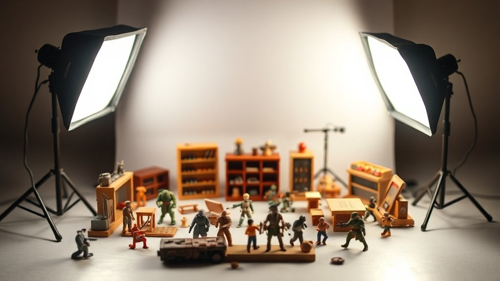 Visual storytelling in toy photography goes beyond just selecting the right equipment; it also involves strategically placing your lights to craft the mood and atmosphere of your scene. Start by deciding the emotion you want to convey. Position lights to create shadows for a mysterious vibe or use soft lighting for a calm, serene setting. Try placing a light behind your subject to create a silhouette, adding drama and intrigue. Experiment with colored gels over your lights to add emotion—warm tones for comfort or cool tones for tension. Remember, light direction can highlight specific features or details, drawing the viewer’s eye to what matters most. By thoughtfully positioning your lights, you’ll transform your toy photography into compelling visual narratives.